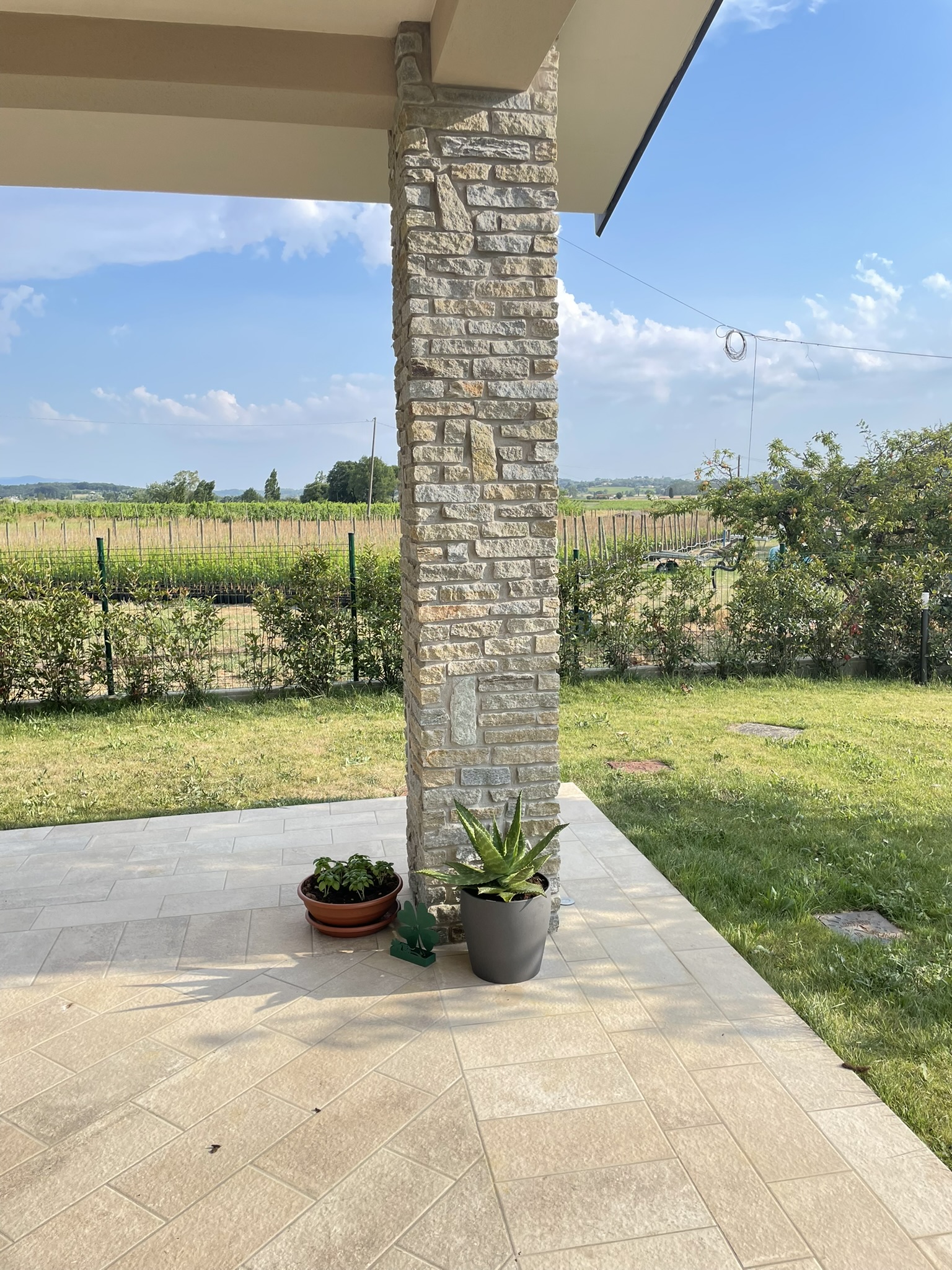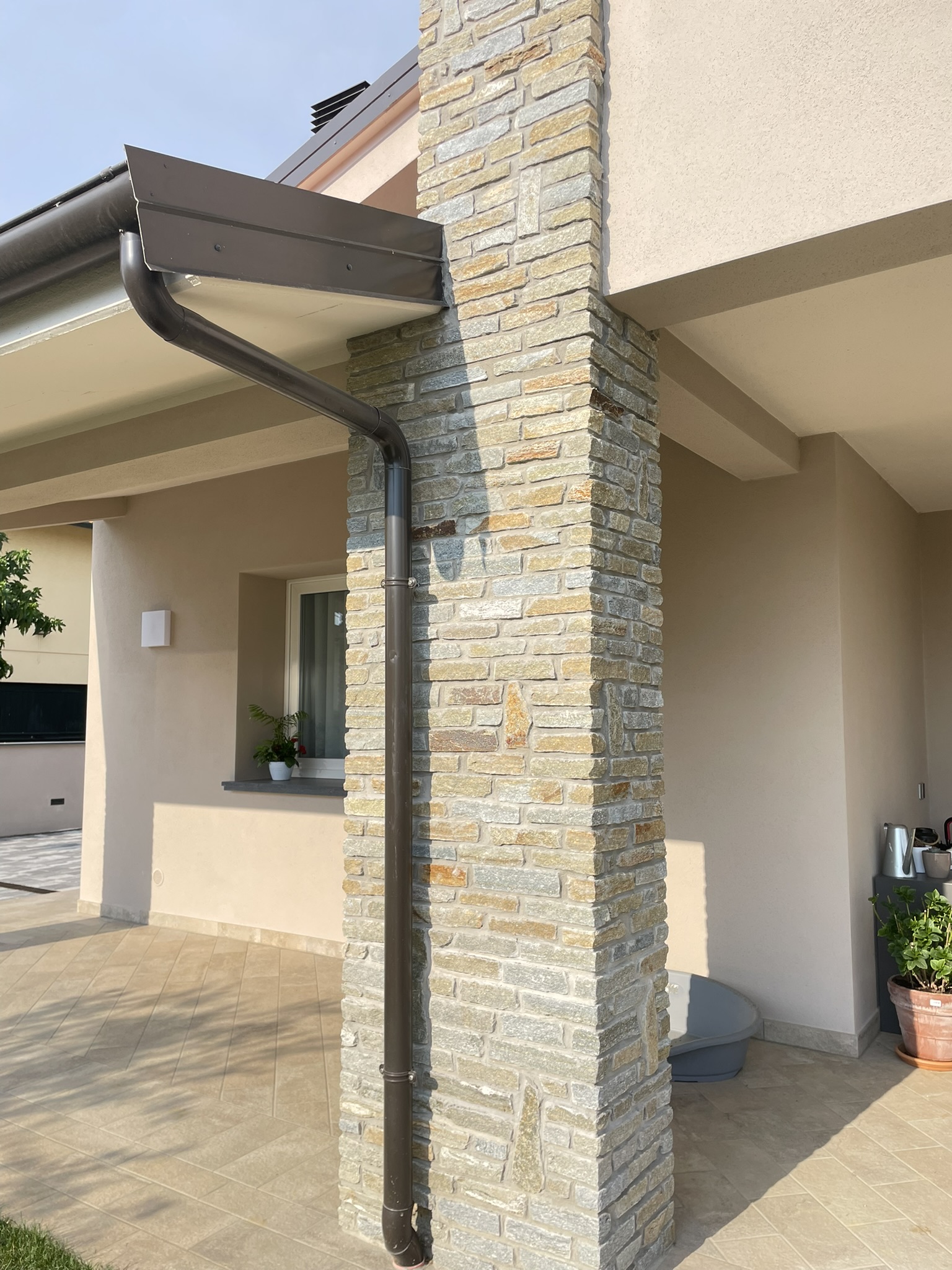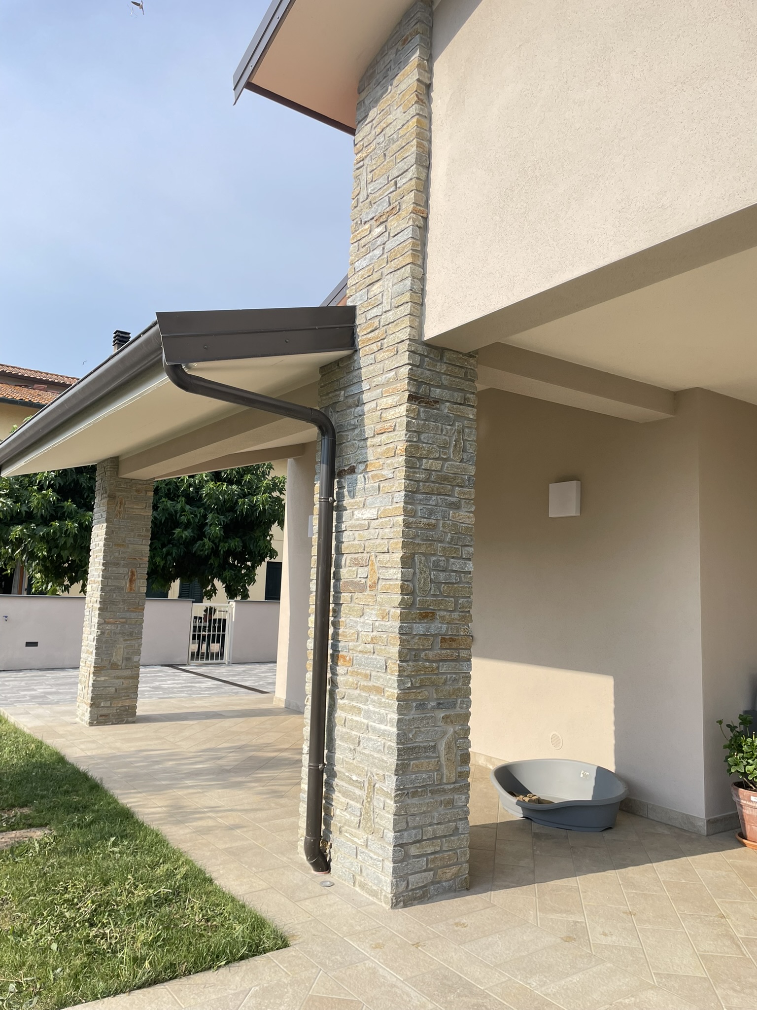 Le colonne sono rivestite con blocchetti in pietra di Luserna, materiale noto per la sua eccezionale resistenza e per l’inconfondibile gioco cromatico. La superficie naturale dei blocchetti conferisce alle colonne un aspetto solido, elegante e senza tempo, capace di integrarsi armoniosamente sia in contesti moderni che tradizionali.