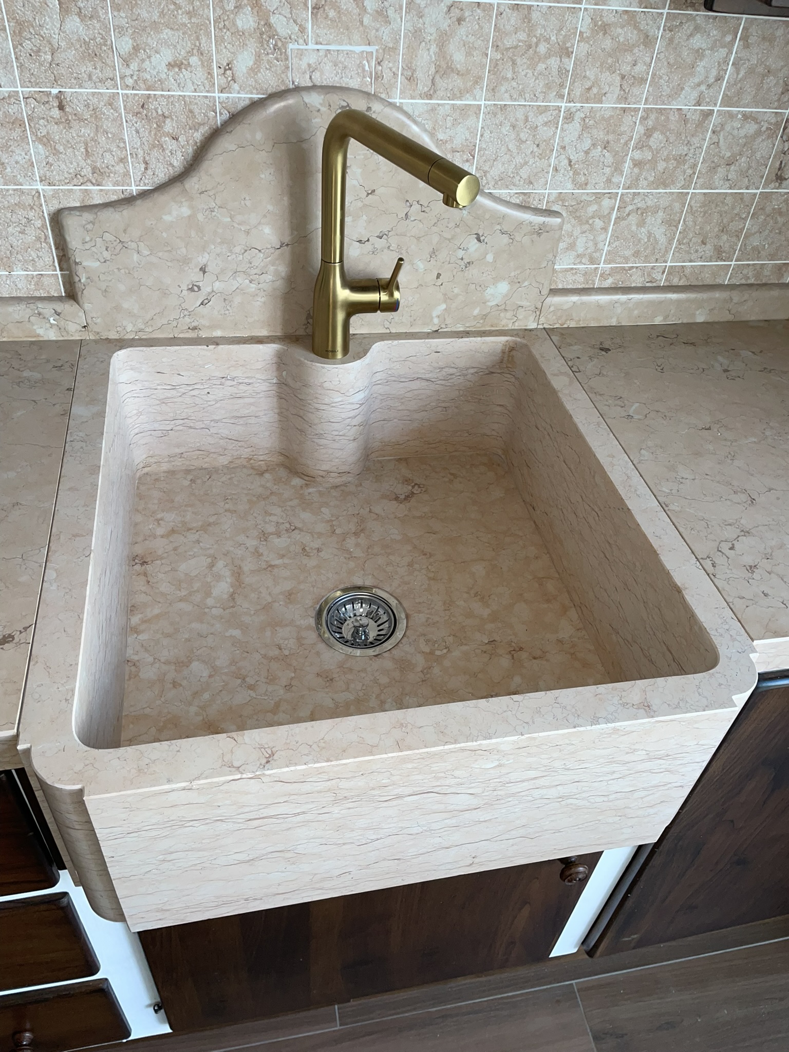 Realizzata in pregiato marmo Rosa di Prun, questa cucina si distingue per la sua straordinaria resistenza e per l’eleganza naturale delle sue venature uniche, diverse in ogni singolo pezzo. Le sfumature calde del rosa, unite ai dettagli materici tipici di questa pietra, conferiscono all’ambiente un carattere raffinato e senza tempo.